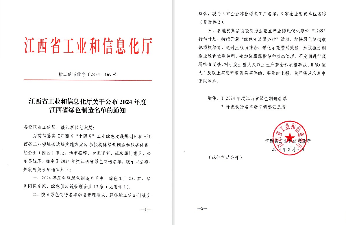 近日,江西省工業(yè)和信息化廳公布了江西省2024年度綠色制造體系名單,根據(jù)《江西省工業(yè)和信息化廳辦公室關(guān)于開展2024年度國家級(jí)綠色制造名單推薦暨省級(jí)綠色制造名單遴選工作的通知》(贛工信辦節(jié)能函〔2024〕20號(hào)),經(jīng)評(píng)審并征求有關(guān)部門意見社會(huì)公示等,確定江西匯仁藥業(yè)股份有限公司獲評(píng)“省級(jí)綠色工廠”。